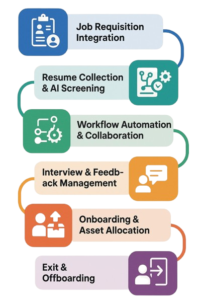 Integrate seamlessly with HRMS/HRIS/Employee Central for job requisition, onboarding, offboarding, and asset allocation workflows, ensuring a smooth transition from candidate to employee and beyond.